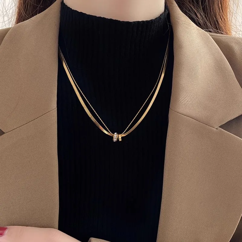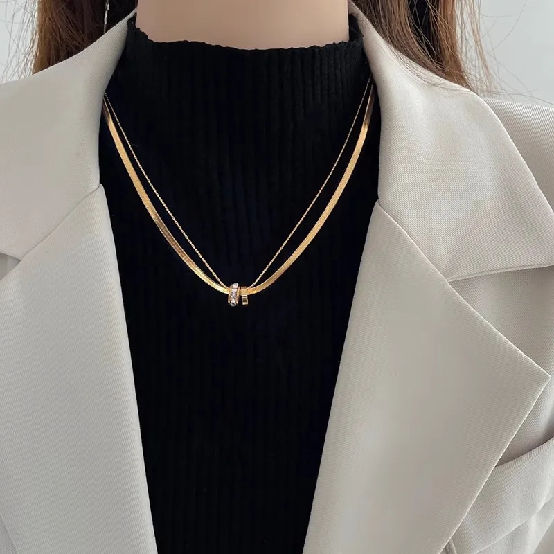 Trendy Stainless Steel Double Layer Necklace for Women Fashion Crystal Bead Pendant Necklaces Clavicle Chain Party Jewelry